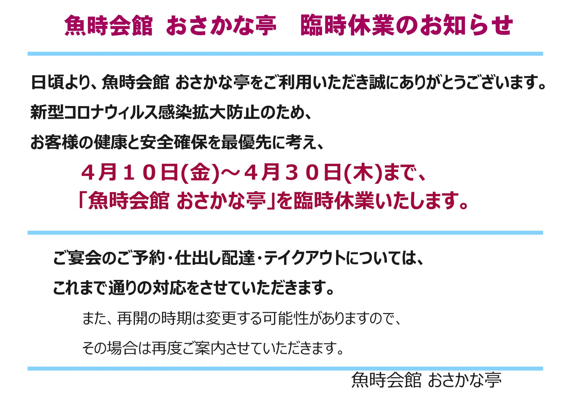 新型コロナウイルスの感染拡大防止のため、お客さまの健康と安全確保を最優先に考え、4月10日から4月30日まで「魚時会館おさかな亭」を臨時休業いたします。