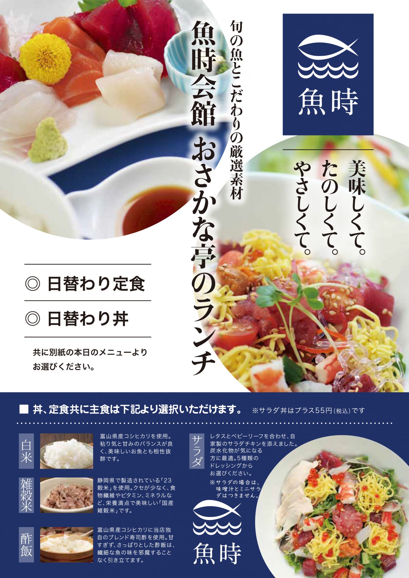 定番メニューは、海鮮ちらし、刺身定食、フライ定食などがあります。その他は、日替わりで合計7種類程度のメニューをご用意しております。