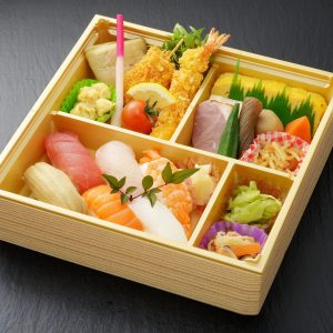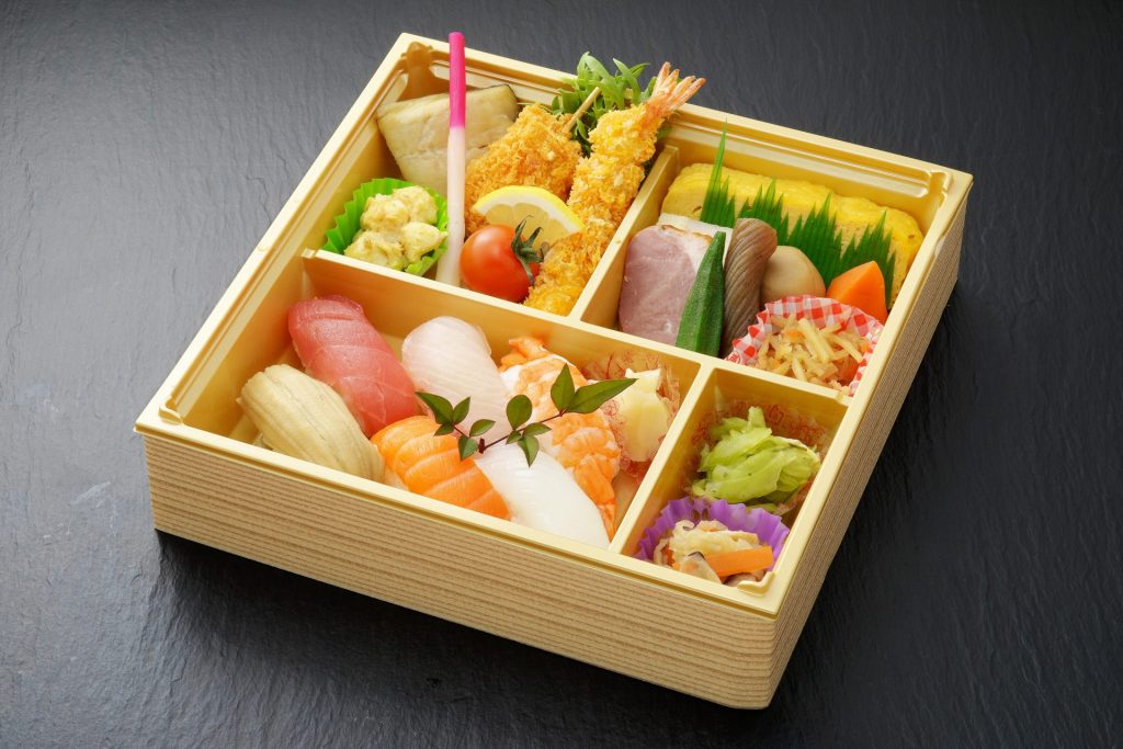 おさかな亭の旬の握りを跳ねさせた、思わず頬が緩むような彩りのお弁当です。お寿司だけではなく、おかずも楽しめるよう種類を多くし、彩も豊かに仕上げました。