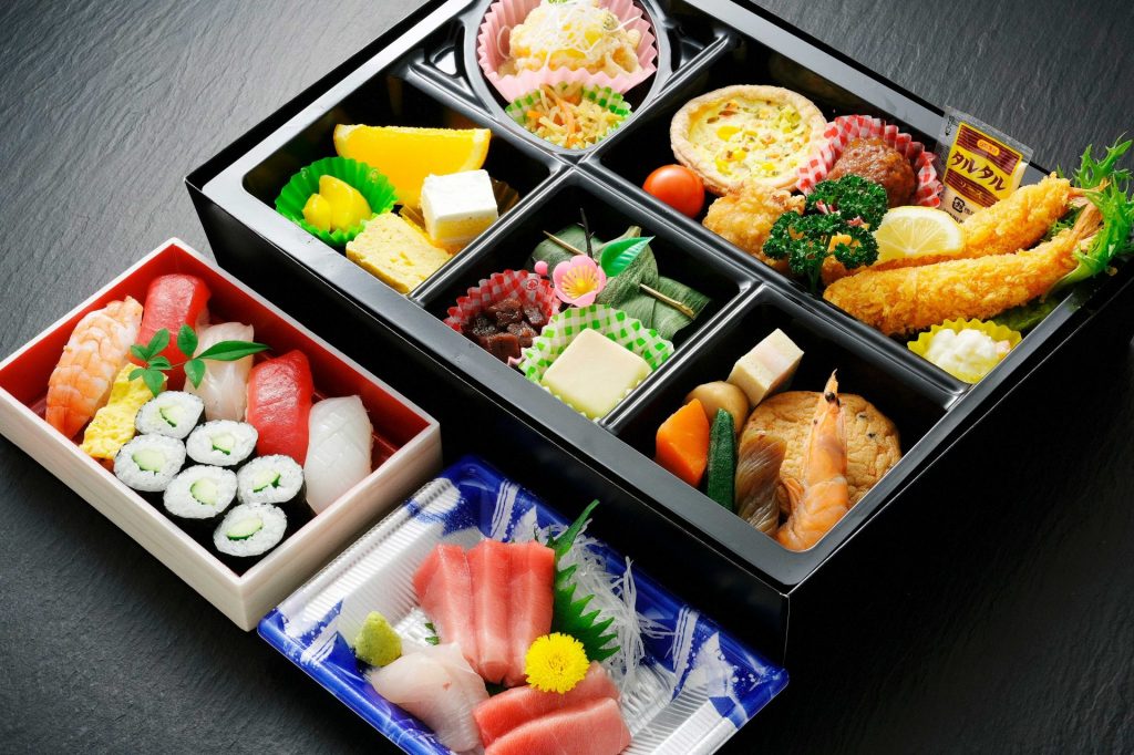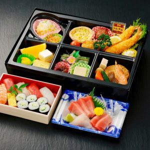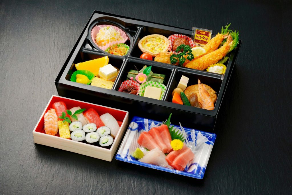 大きなエビフライ2本が特徴の和洋折衷の一段弁当です。お寿司やお刺身もしっかりと揃えており、食べ応えも十分な御料理となっております。