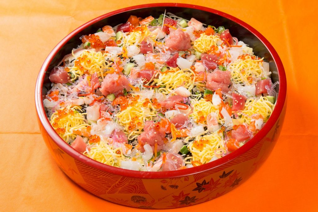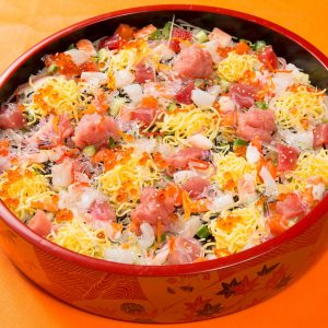 当店人気No.1の「海鮮ちらし」を桶に盛り付け。美味しくて見た目も華やかです。お祝い事やホームパーティに最適な一品。(標準は4人前)