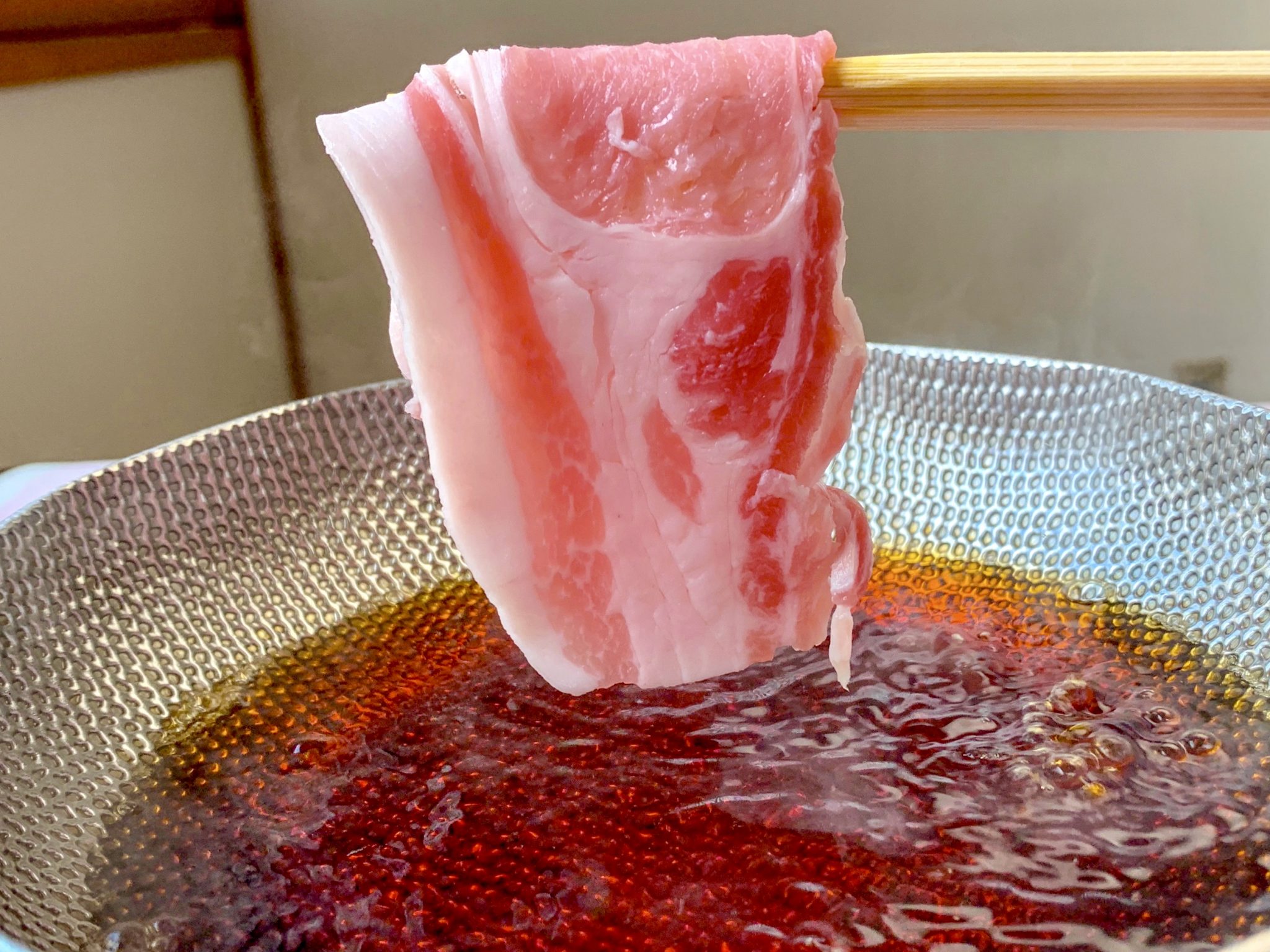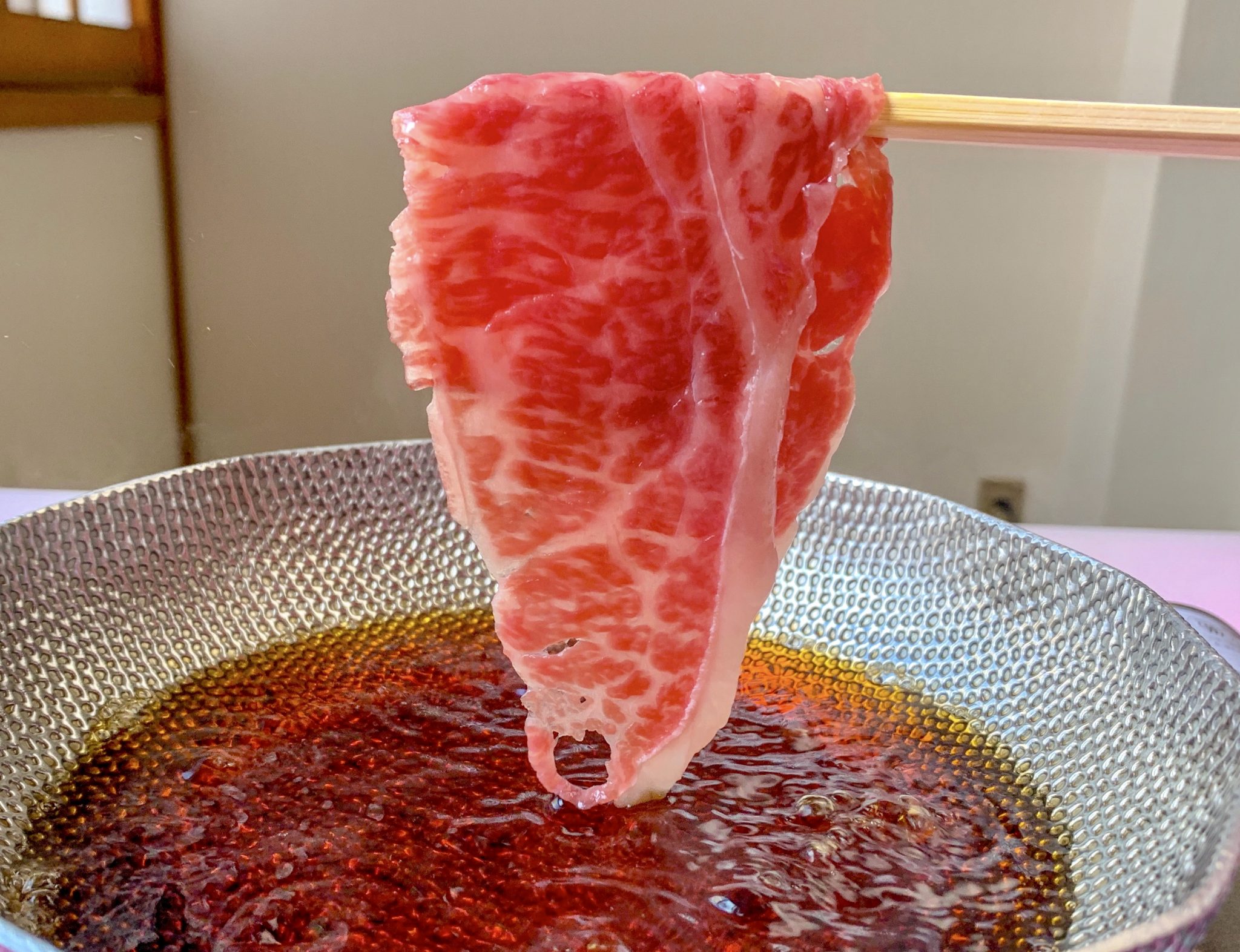 すきしゃぶとは、すき焼き用の割下を薄めて、素材をさっとくぐらせて食べる「すき焼き」と「しゃぶしゃぶ」の良いところ取りのような料理。はじめは素材の味を楽しみつつ、割下が煮詰まることで時間と共に味が変化していきます。