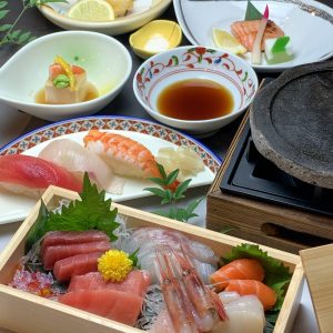 planコース コース海鮮溶岩焼コース◇海鮮素材/溶岩焼/お刺身/お寿司… 海鮮溶岩焼コース◇海鮮素材/溶岩焼/お刺身/お寿司… 会合宴会・交流会慶事・お祝い法事・法要 コース 6050円(税込) 富士山の溶岩石を切り出した「溶岩石プレート」を使い、「魚時会館おさかな亭」自慢の海鮮素材を楽しむ「溶岩焼コース」です。1日30名様限定。 別途、下記のサービス料を頂戴しております。 1F魚時会館おさかな亭 昼:無料 夜:ご飲酒の方:300円(それ以外の方:1時間以上のご利用で300円) 2F魚時会館 昼・夜:10% お品書き 「溶岩焼」とは、溶岩石プレートなどで素材を焼く調理法です。多量の遠赤外線で素材の内部から加熱するため、旨み成分を閉じ込め美味しく焼き上げることができます。 こちらのコースでは、贅沢に一人様にひとつの専用プレートをご用意し、お好みのタイミングで召し上がることができます。 メインの食材には、「魚時会館おさかな亭」自慢の新鮮な海鮮素材をご用意。特上のまぐろ、ホタテ、白身魚、甘海老などを遠赤外線で焼くことで、お刺身とは違った旨みを引き出します。こちらの海鮮素材は、そのままお刺身としても召し上がれます。 目利きで選び抜かれ、匠の技で造られるお刺身やお寿司との贅沢な最上級のコースをお楽しみください。 【コース内容(全7品)】 海鮮溶岩焼き 焼き野菜盛り合わせ 前菜二点盛 自社製漬魚の西京焼き 揚物 お寿司(3貫) デザート ※こちらは、飲み放題無しのコースとなっております。 ※内容は仕入れによって変わることもございます。 受付人数 2名様~70名様 予約期限 2営業日前の15時までにご予約ください 提供期間 通年 提供時間 120分
