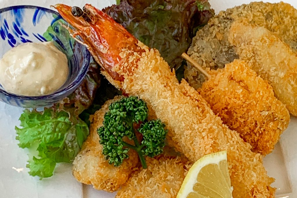 みんな大好きなフライの盛り合わせ!「天国に一番近い島」からきた「天使の海老」の海老フライ入りです。ソースは勿論、温かければお塩で食べるのもおすすめです!(温める場合は、オーブンの使用をお勧めします)