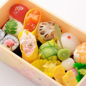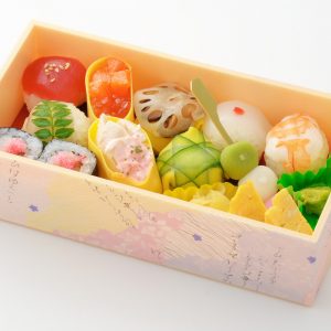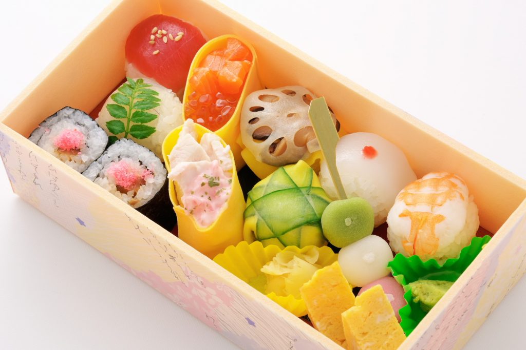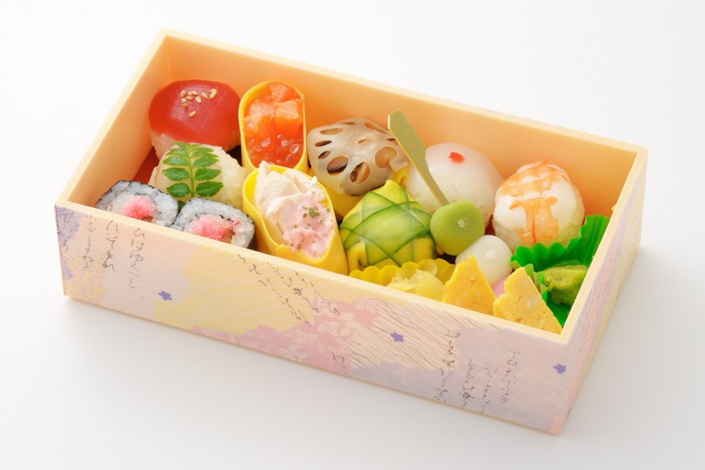 春らしい華やかな彩の手まり寿司。桃の節句や行楽にもおすすめです。